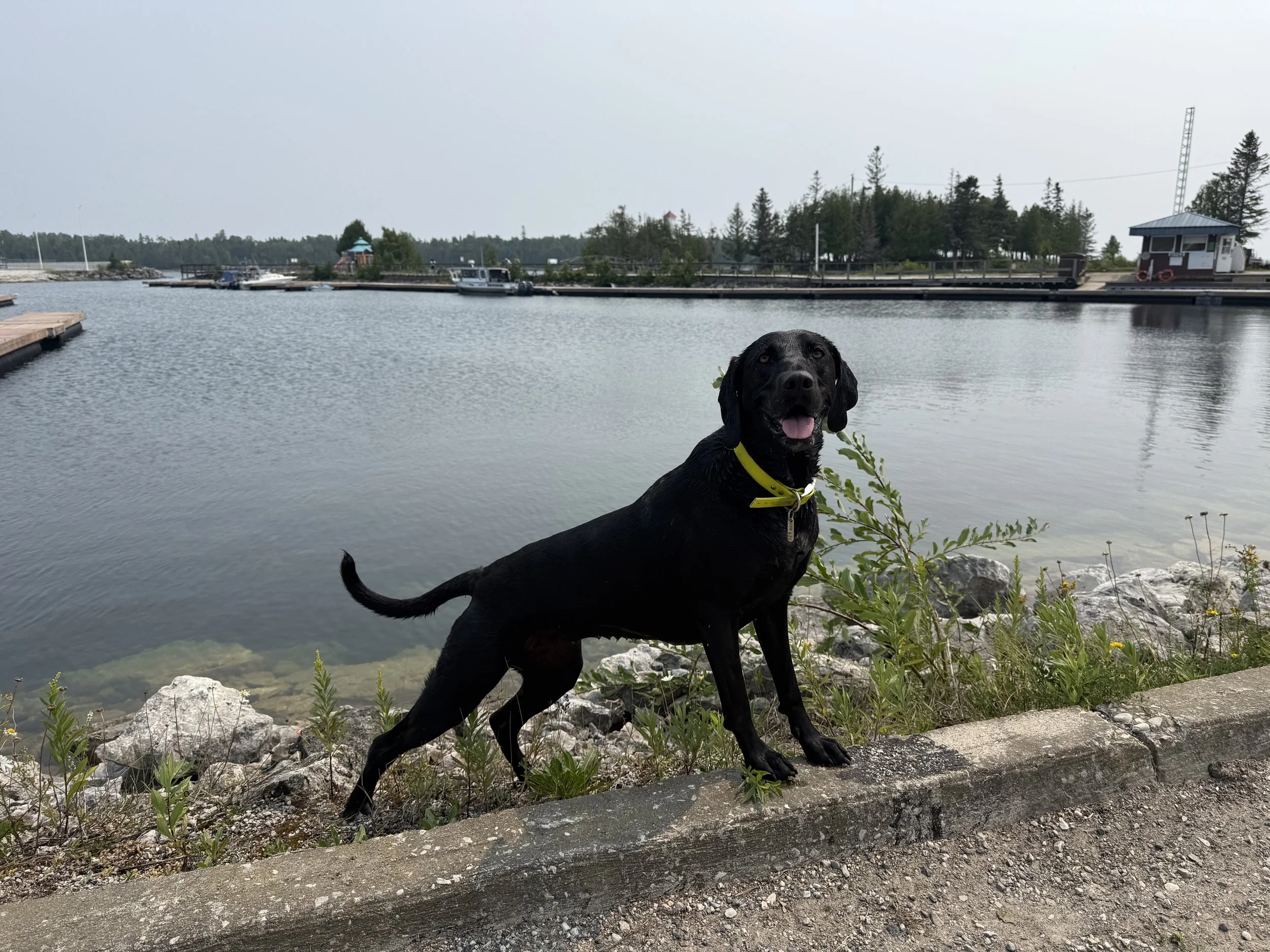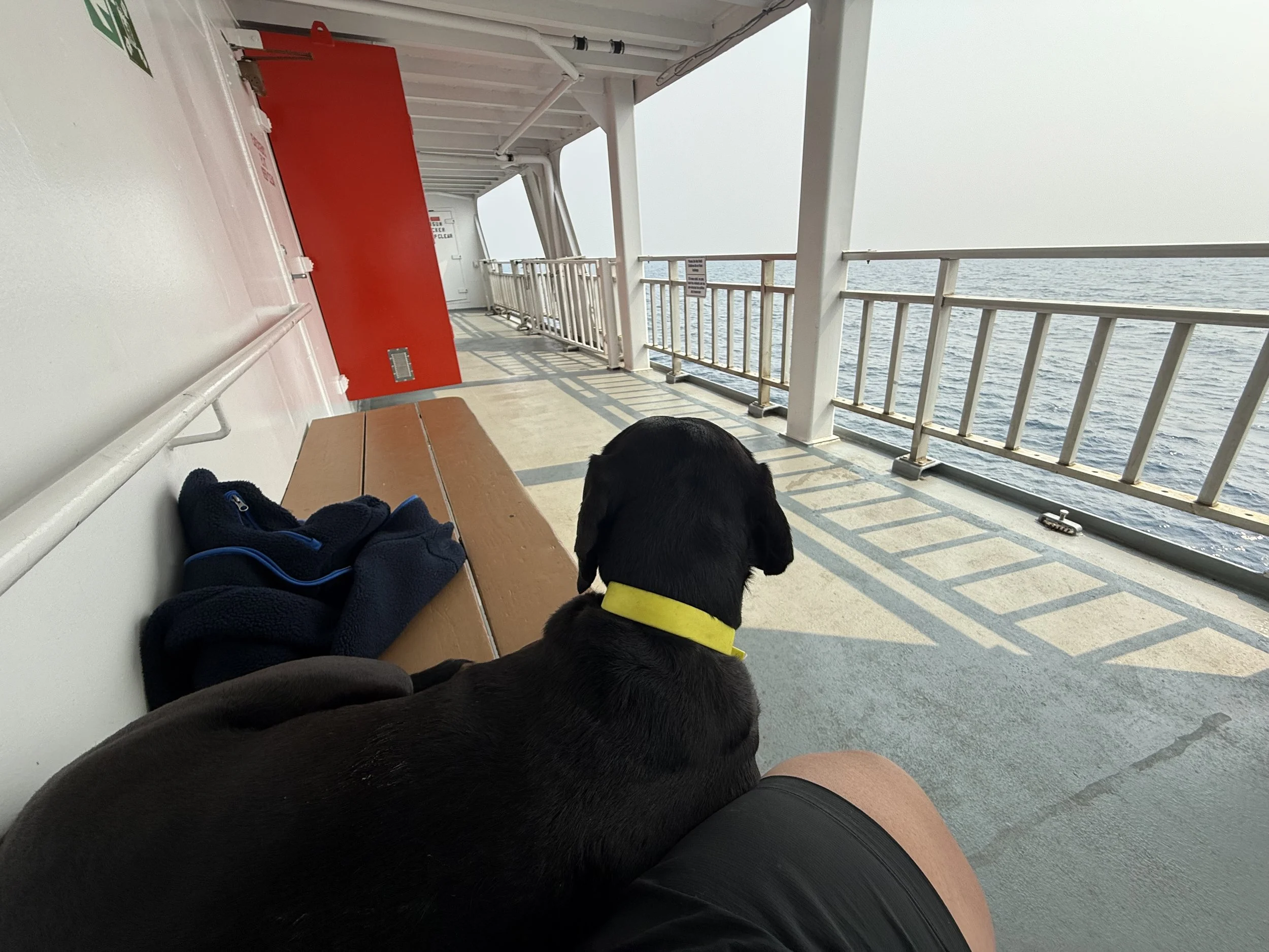 Had time to kill before loading so had some lunch and walked Juno around. She did some swimmies at the nearby marina. Lots of other doggos waiting to get on the ferry! We watched the ferry come in and as it was turning into the channel it honked its horn and Juno panicked. If she hadn’t been leashed she would have run back to Toronto I think.
